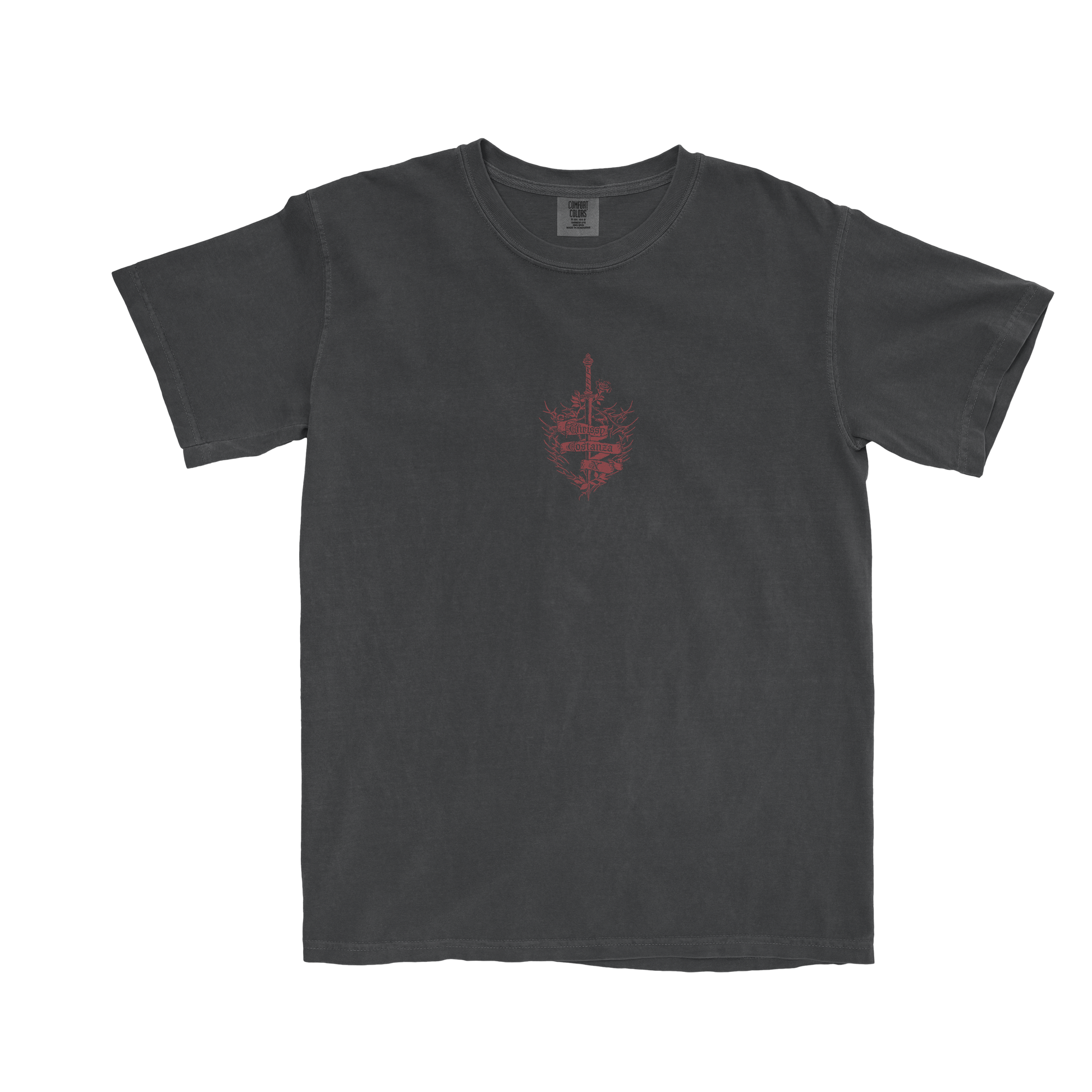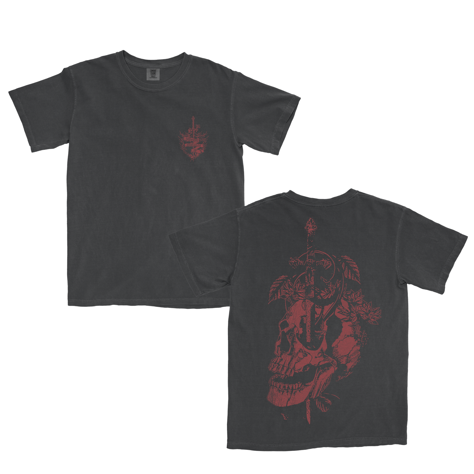 Distressed black tee with a red crest print on the front and detailed back artwork of a sword-pierced skull wrapped in vines.