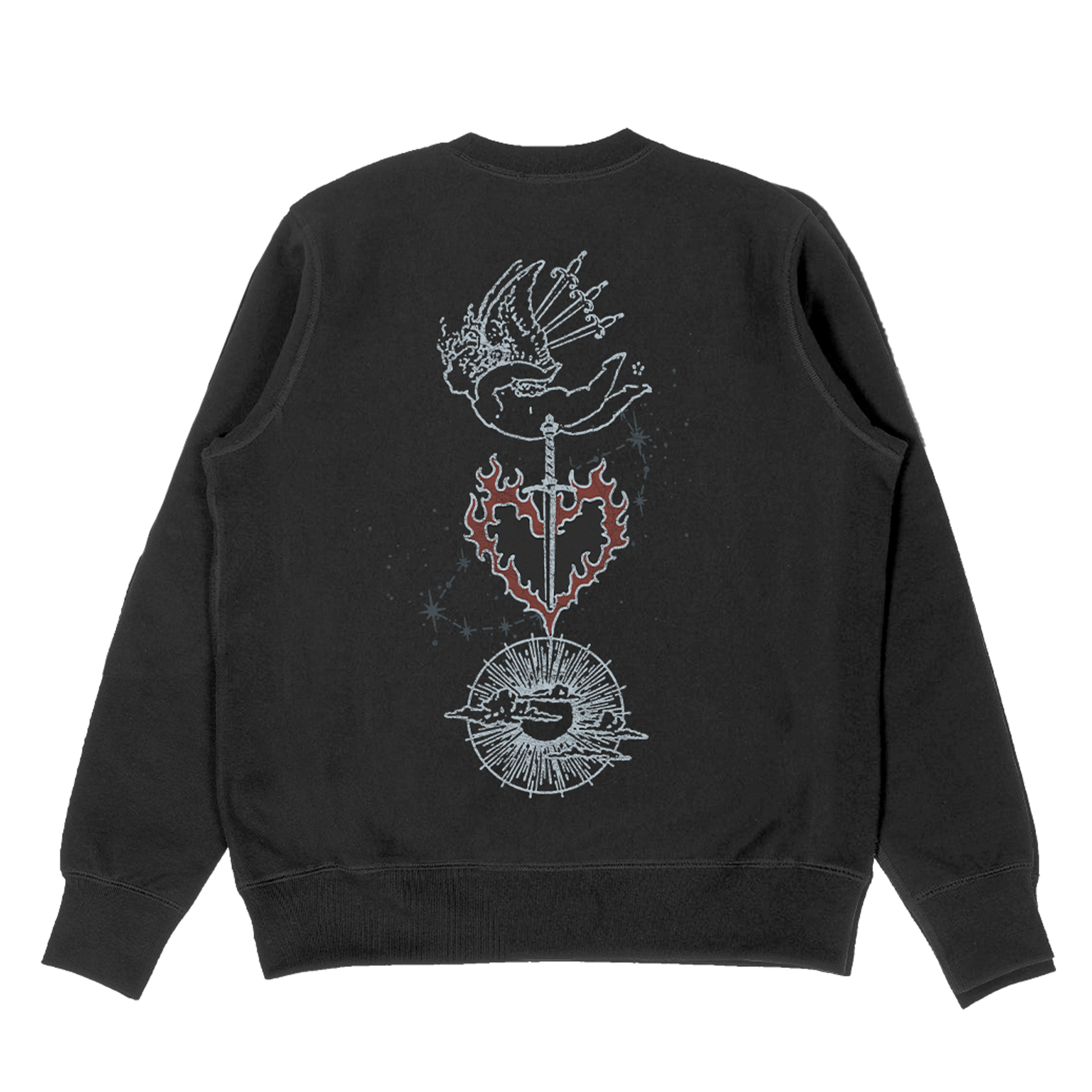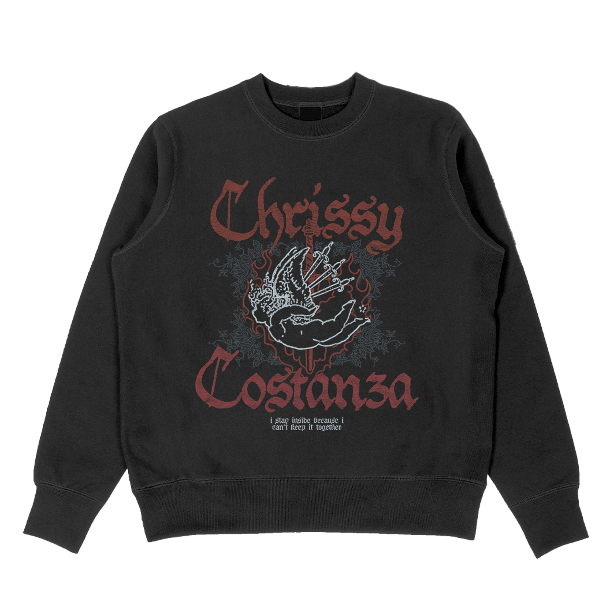 Premium black crewneck featuring a large front graphic with fallen angel icon and full Chrissy logo, and a back featuring more icons inspired by songs from the album.